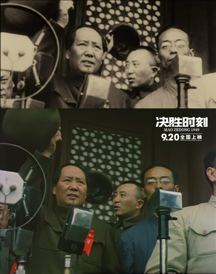 此前各类影片中,涉及开国大典的内容多是引用黑白史料录像,时代差距感明显。