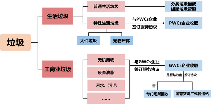 新加坡垃圾处理体系的前端为个体行为,居民或工商户需要按照规定将生活垃圾进行初步的分类。如下图所示,按照收运方式的区别,可分为居民生活垃圾和工商业垃圾。对于普通生活垃圾,居民需要自行投放至分类垃圾桶或通过垃圾管道投放至垃圾厢房;对于特殊生活垃圾及工商业垃圾,居民和工商户需联系GWCs企业上门收取。