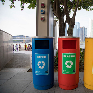 新加坡居民的普通生活垃圾由居民自行投放,可通过分类垃圾桶和组屋垃圾管道两种途径投放垃圾。PWCs企业按服务区域设置分类垃圾桶,分为可回收垃圾桶和不可回收垃圾桶两类。通常情况下可回收垃圾桶为蓝色,上有可回收标志,并标有典型可回收垃圾图样;不可回收垃圾桶通常为绿色。在可回收垃圾产量较大区域(如学校、居民区),可回收垃圾桶细分为纸制品回收桶、塑料回收桶及玻璃回收桶,并以不同颜色和标识区分。新加坡的垃圾桶上标有详细的分类说明和图示,便于投放者精确地进行垃圾投放。此外,新加坡在一些特殊区域设有针对电子垃圾的回收桶,针对电子垃圾体积通常较大的特点设计了较大的投放口。新加坡针对不同场所的垃圾投放需求,设置了不同数量、样式的垃圾桶,具有较好的弹性。居民需将产生的普通生活垃圾按照分类标准,投入对应垃圾桶,垃圾桶附近设有监控,如居民未能按照分类标准进行投放,一经发现将面临严厉处罚。