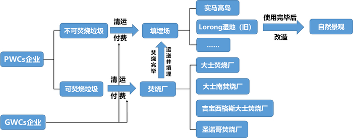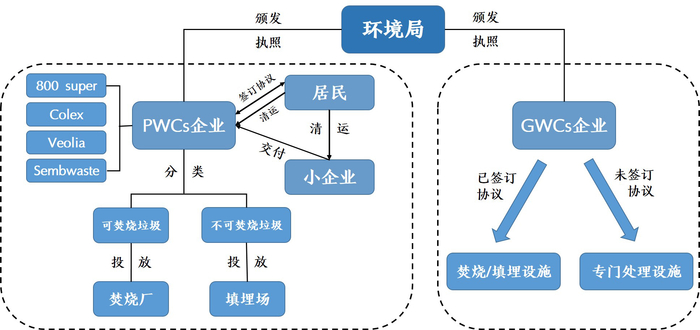 经过近30年的实践,新加坡形成了以环保部为核心、法律为框架、企业及居民为基础的垃圾处理体系。新加坡的垃圾收运系统以环境部下属国营企业为主,持有政府部门颁发执照的私营企业为辅。上述两种企业分属于公共固体废物收集系统(PWCs)及一般固体废物收集系统(GWCs),主要作用于垃圾处理的前端和中端,负责固废收运。环境收运系统与前端居民的投放行为及后端政府的焚烧或填埋处理相结合,构成了新加坡完整的垃圾处理体系。