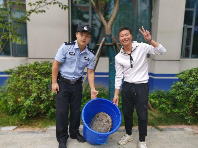 接警后,值班民警王轲、王春然立即出警至现场了解情况。到场后,发现报警人已将乌龟放到了垃圾桶内。