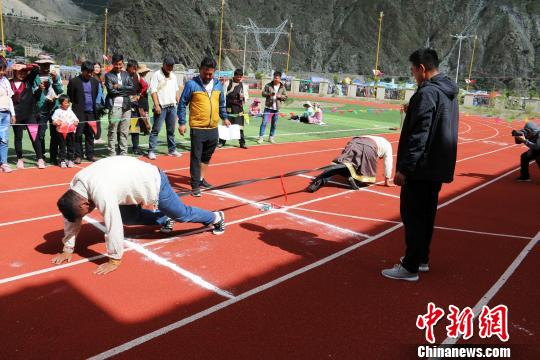 17日,西藏朗县第四届塔布文化旅游节暨第二届农牧民丰收节开幕。图为民族特色体育比赛抱沙袋。供图