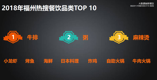 作为中国最早连接世界的城市之一,福州餐饮业展现出高度开放融合的发展趋势。以2018年福州热搜餐饮品类为例,前三分别是牛排、粥、麻辣烫。牛排是西餐中最常见的食物之一,而麻辣烫则是遍布中国的平民美食。