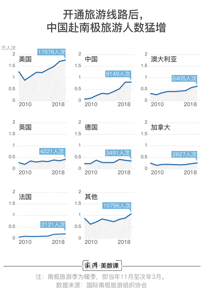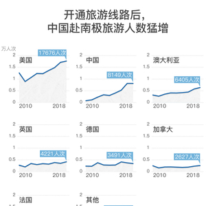 根据IAATO的统计,在2018年的南极旅游季中,中国赴南极旅游人数达到了8149人次;而2010年时,这一数字仅为806人次。另外,IAATO只披露游客数较多的国家,除了中国,被单拎出来的都是欧美国家。