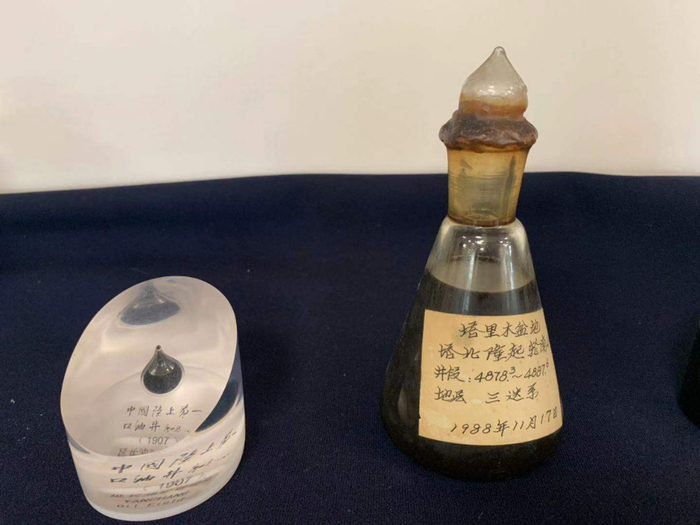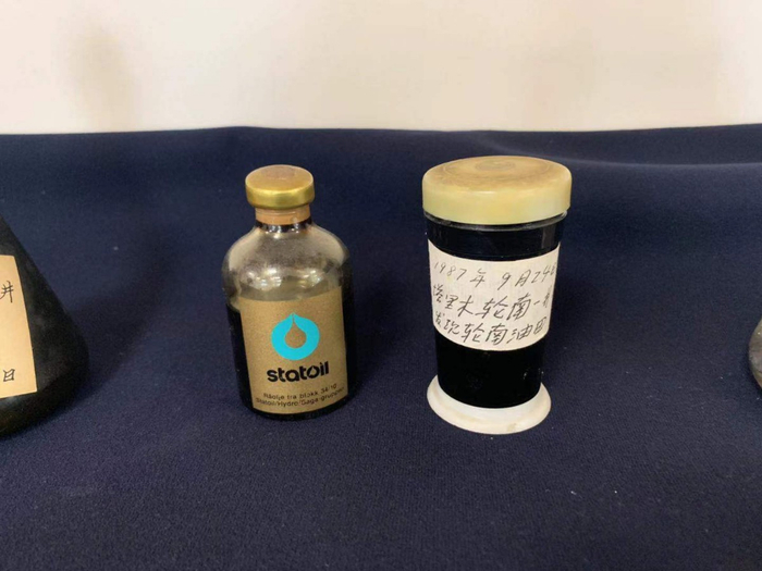 “大庆油田十年稳产纪念”“塔里木原油”“中国陆上第一口油井延长油矿”……“这是装在我高血压药盒里的原油样本。”王老拿起1987年塔里木轮南一井原油样本的小黑盒子介绍,当时因为长期奔波,自己身体不好正在服药,到轮南时,身边只有药盒,就用它了。