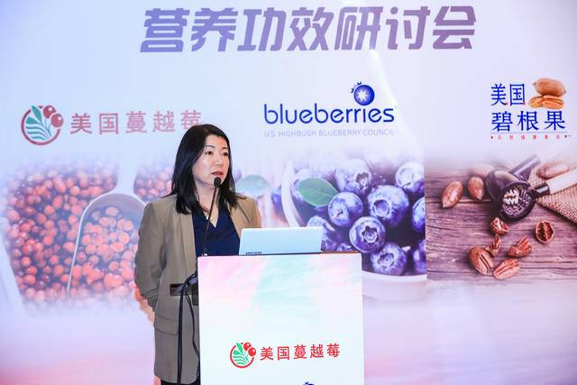 同样是“超级水果”的美国高丛蓝莓,于1916年开始成功商业化量产种植,如今已有百年历史并发展至世界范围。高丛蓝莓富含花青素,纤维素,维生素C和丰富的钙质,花青素有助于保护 视力,纤维素有利于肠道健康,维生素C有抗氧化作用。会议上,专注于食品行业23年,美国高丛蓝莓协会顾问朱红芳女士全面解析了美国高丛蓝莓种植源头、树种的选择,乃至美国33个州 蓝莓的收获季节,以及蓝莓作为食品原料的分类和蓝莓深加工产品的延展面,以此推介给大家新产品原料所带来的附加价值。