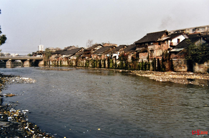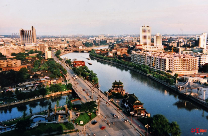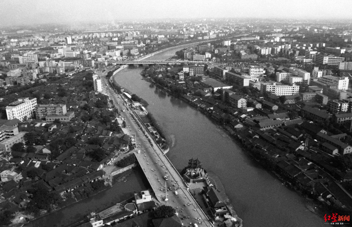 ↑1997年7月,府南河改造基本完工,严永聪登上位于滨江东路与天仙桥南街口的一栋楼顶上拍摄。