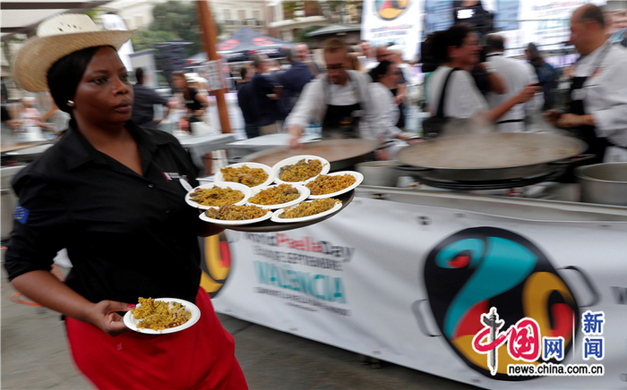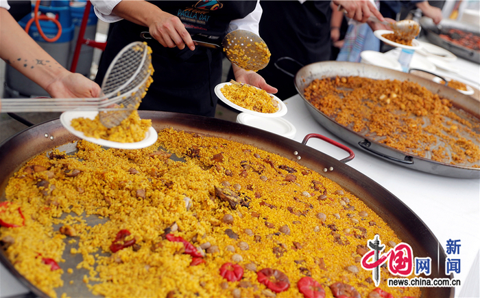 当地时间2019年9月20日,西班牙瓦伦西亚,西班牙海鲜饭的起源地、海滨城市瓦伦西亚迎来“世界海鲜饭日”,当地市政厅广场供应海鲜饭供游人和市民享用。epa/IC photo