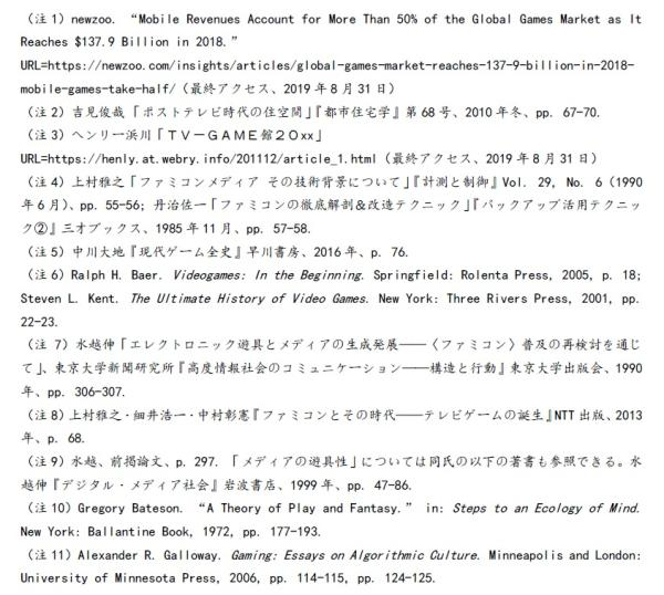 但我认为,正因“电视游戏”在日本被人彻底遗忘,我们才更加需要重新回答“何为电视游戏”这一问题。换言之,现如今我们必须重新考虑“电视游戏”的特有属性及独特经验,而“视频游戏”、“数字游戏”等词却难以对其做出准确概括。这不仅仅是出于一名研究人员的责任,更多的是出于我个人的求知欲。具体而言,我想要知道是什么东西让我在小时候如痴如狂。本文虽然篇幅较少,却是我重新认识“电视游戏”的第一步。