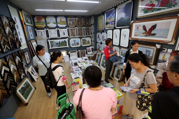 “喜欢哪件进来试一试,全场服装一律五折。”第一天正式营业,天通尾货二楼不少商户的店员都站在自家新装修的铺面前招揽着生意,吆喝着各种折扣和优惠的活动,兴奋劲儿一点儿也不比消费者少。除了服装鞋帽,床品箱包、茶具五金、裱画佩框的商铺都是应有尽有。