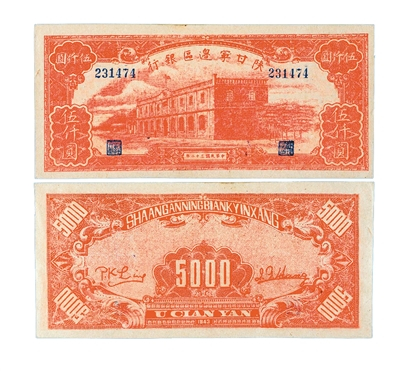 陕甘宁边区银行发行的“大楼图案”伍仟圆“边币”