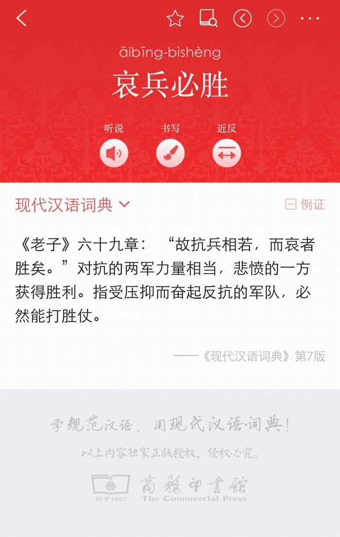 首先,记者在App Store 搜索“现代汉语词典”便找到了这款App,并免费进行了下载。打开App首页,可以直接在搜索框内搜索想要查询的字词。记者点击搜索框,出现了一个“热搜”的下拉菜单,记者又在菜单中点击“哀兵必胜”,这时页面显示了该成语的出处、示意。点击“听说”可以听到李瑞英的读音;点击“书写”可以看到这四个字的动态标准笔顺演示;点击“近反”还可以看到该词的反义词为“骄兵必败”。