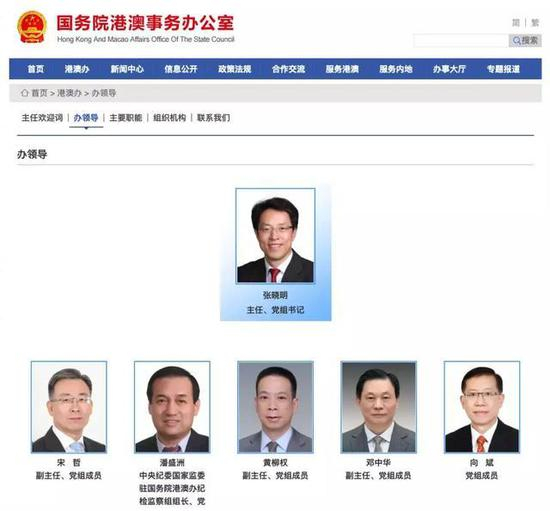 长安街知事注意到,国务院港澳办目前共有6位领导,分别是:主任、党组书记张晓明,副主任、党组成员宋哲、黄柳权、邓中华,中央纪委国家监委驻办纪检监察组长、党组成员潘盛洲,以及党组成员向斌。