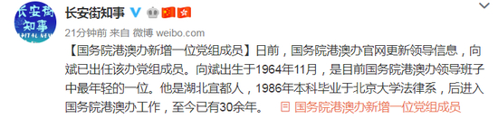 日前,国务院港澳办官网更新领导信息,向斌已出任该办党组成员。