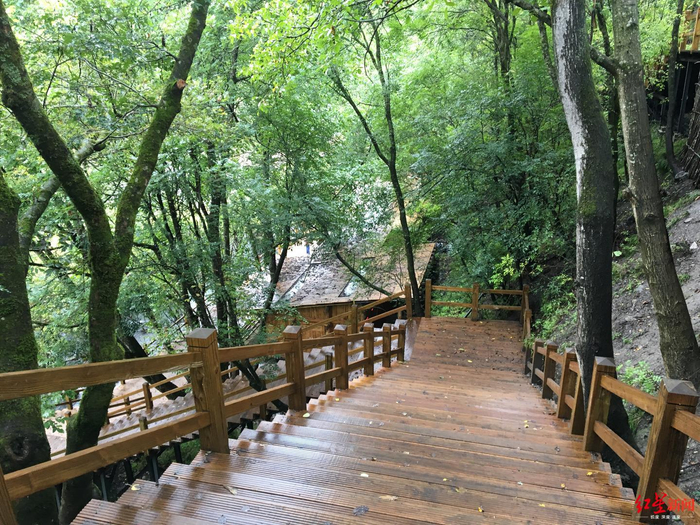 据景区工作人员介绍,栈道巨大投入,一根宽12公分、厚5公分、长两米的木条就需要人民54元左右。红星新闻特别报道组看到,景区在修建栈道时,也打足了生态牌,坚持“见石避石、见树让树”的理念,在栈道经过之处,哪怕只有一颗小树,栈道都会细心“开口”,给树留出生长位,栈道挡了石头,栈道也会“主动”切割出石头的轮廓,保留石头的“原形”。