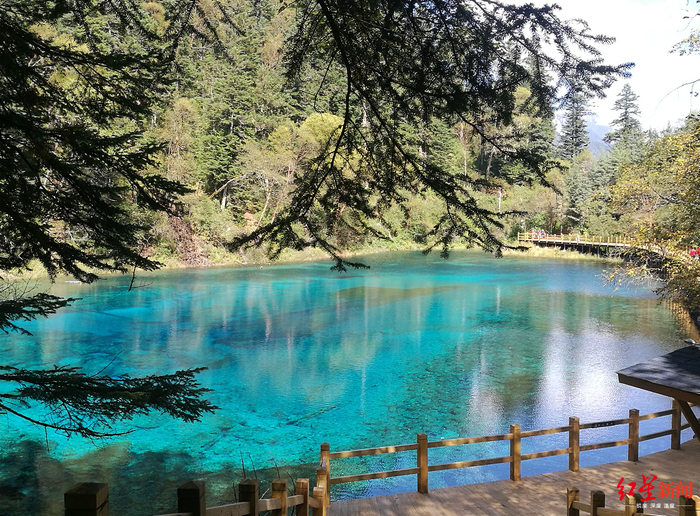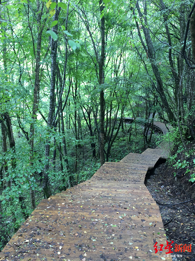 在树正群海周边新修的栈道早已完工,红星新闻特别报道组行走在打磨后的栈道上,发现稳固性和防滑性都不错,而时不时从栈道中“冒”出的大树,让人觉得不是在逛景区,而是漫步在大森林中。