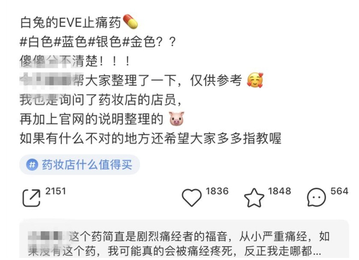 白兔的止痛片是很多女生痛经时的“救命药”,它有四个版本,白色基础版、蓝色升级版、银色加强版、金色顶级版,四个版本止痛效果是逐渐增加。