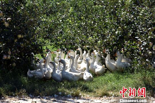 在现代苹果示范园里,林下养大鹅,帮助清除杂草,鹅粪作果树肥料,又增加了经济效益。 朱志庚 摄