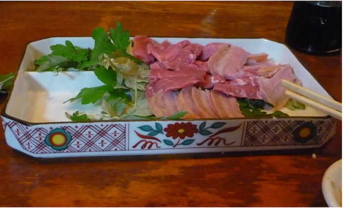 假若可以套用这个书名的话,“琉球之猪”大概称得上“冲绳料理”具有自己特色的一个典型例子。众所周知,猪肉在中国人的餐桌上占有极端重要的地位,至今猪肉消费量仍然超过肉类总消费量的60%。与之形成鲜明对照的是,在传统的日本料理里,猪肉的地位相当边缘化。究其原因,公元8世纪时,受到佛教教义的影响,天武天皇发下“禁肉令”,宣称吃啥变啥,吃肉要坠入“畜生道”,所以不许吃四条腿动物的肉。结果在“明治维新”前的很长一段时间,肉食在普通日本人生活中变成了“病人”滋补的特权。《一个单身赴任下级武士的江户日记》里便记载了酒井伴四郎多次以感冒为由前去大啖猪肉。甚至猪肉都不能直呼其名,而要讳称“山鲸”——因为鲸与鱼类一样不在禁食之列。