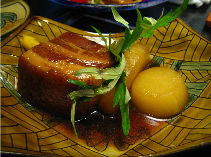 实际上,“冲绳料理”很多菜品都离不开猪肉。其烹饪方法也与中餐十分相似,都会使用料酒、茴香、五香粉等香料一起烹饪。其中深受喜欢的一道菜叫做“豚角煮”。它与中国的“东坡肉”很相似,要将肥瘦参半的五花腩加豉油、糖等煮两个半小时,煮至酥软。不言而喻,“豚角煮”在口感上与寿司,刺身之类的清淡日式料理区别很大。就算是源自日本本土的“关东煮”,冲绳人也习惯添加猪蹄作为食材之一,就连其汤汁也是猪骨汤。
