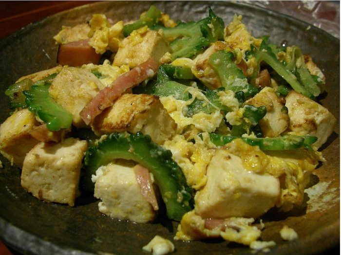 而在“冲绳料理”中,恰恰有着“炒”的一席之地。在日本最有名的“冲绳料理”就是冲绳杂炒(チャンプルー),由蔬菜和豆腐等材料炒制而成,比如苦瓜杂炒(ゴーヤーチャンプルー)。这道菜的很容易让人联想到中餐里的家常菜——炒苦瓜。而且与中国的方法相似,“苦瓜杂炒”在炒的时候也要加上鸡蛋。冲绳人还按照自己的饮食习惯,在苦瓜炒鸡蛋里加入豆腐和猪肉一起拌炒。
