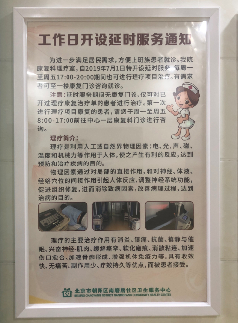 事实上,开设延时服务在南磨房社区卫生服务中心已经不是头一次。“除了全科诊疗、药房和化验等基础延时服务以外,中心还在去年9月推出中医科推拿治疗室的夜诊,同样是从晚上5点延长到8点。”李尨表示,这一系列举措,目的都是希望更好地为患者提供服务,改善居民的就医体验,从患者反馈来看,也的确很受认可和欢迎。