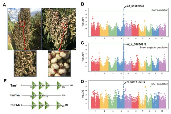 图1: GWAS分析检测到Tannin1基因是影响高粱抗鸟的单主效位点。(A) 左代表鸟吃的高粱品种表型,右代表鸟不吃的高粱品种表型。(B)和(C) 两个GWAS群体检测到的单主效位点和缩合单宁含量检测到的Tannin1位点(D) 是共线的。(E) Tannin1的自然变异类型。