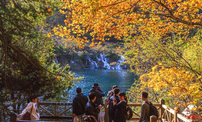 ↑2016年10月,游客在九寨沟景区拍照