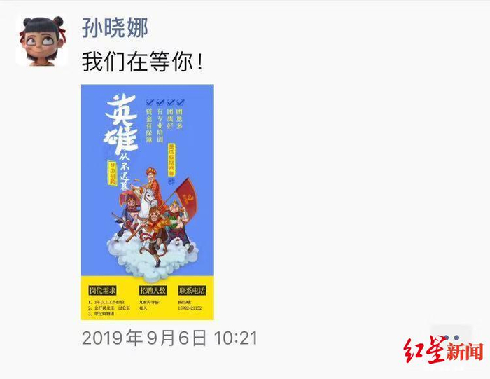 9月16日,孙晓娜在自己的朋友圈里发了一张招聘40名九寨沟导游的海报,并配文:我们在等你。几天后,这张心急的海报再次被放在了朋友圈,招聘人数依旧是40人。