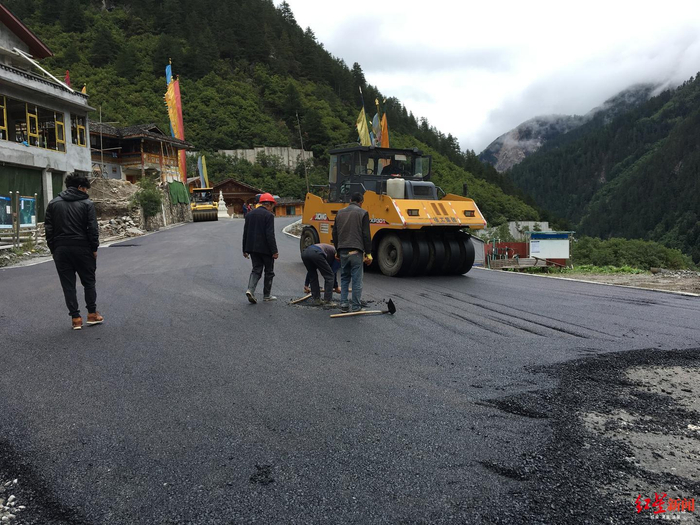 9月19日,寨子门前的沥青路正在铺设,尤仲格萨和寨子里两位年轻人站在大门前有说有笑。地震后,寨子里很多人家都换了新房。他的家在进寨子的左手边。