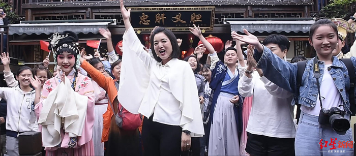 白雪一边唱,一边迈上英雄三国舞台,2名年轻的川剧演员也一边合唱一边随她登台,正在二楼喝茶的游客听到歌声,纷纷探身推窗往下瞧。看到白雪后,大家脸上满是惊喜,争相下楼与她一起合唱。一曲唱罢,大家纷纷以比心的形式,向祖国表白:“我爱你中国!”“我给祖国比心!”