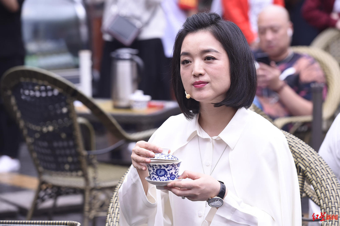 露天坝坝茶的茶座上,一女子一边喝茶一边欣赏川剧演出,有游客认出,她就是著名歌手白雪。“白雪!我们经常在电视上看到她!”来自西安的林女士说。