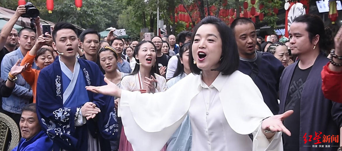 很多游客似乎预感到了什么,激动地拿出手机。川剧演员表演完毕,在众人的瞩目中,白雪站起身来,开始了活力四射的演唱,“古老的东方有一条龙……”她的歌喉高亢、嘹亮、充满激情,唱出了中国人的文化自信,在场的群众被感染了,纷纷跟随她离开茶座,向英雄三国广场走去。