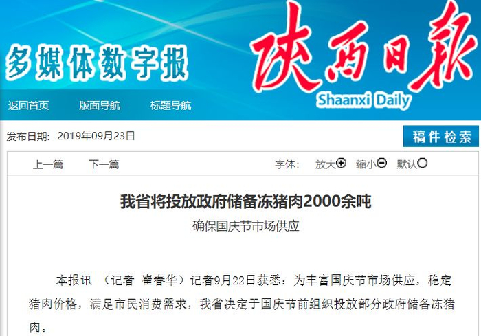 近期,西安(780吨)、大连(700吨)等城市也相继宣布向消费市场投放市级储备肉。据《陕西日报》,陕西省决定于国庆节前投放政府储备冻猪肉2000余吨。