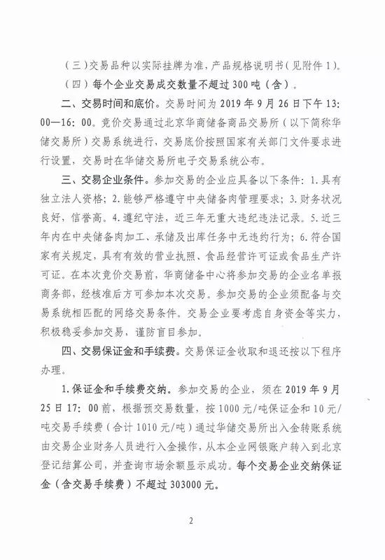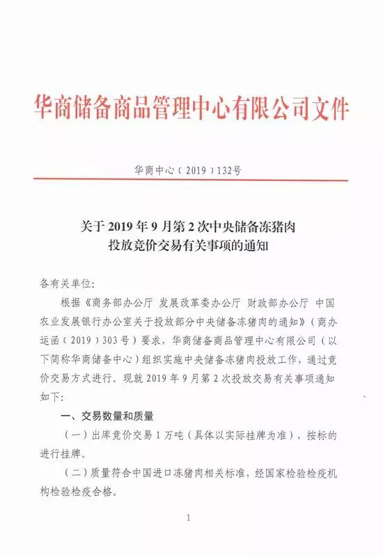 9月24日,华储网发布《关于2019年9月第2次中央储备冻猪肉投放竞价交易有关事项的通知》。《通知》指出,将出库竞价交易1万吨冻猪肉,按标的进行挂牌,其中每个企业交易成交数量不超过300吨(含)。