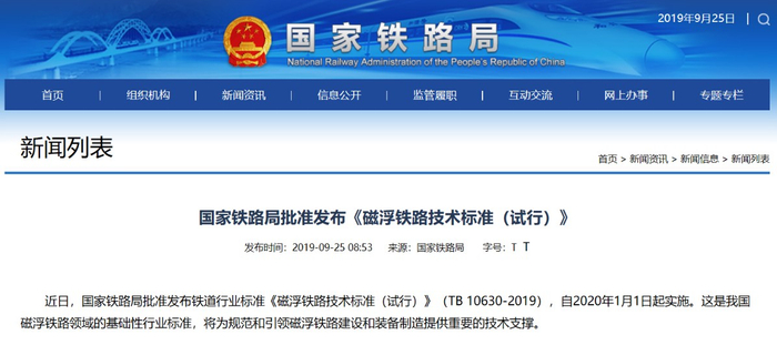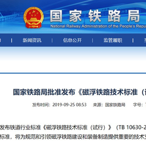 此次发布的《标准》确定了先期按常导短定子和常导长定子两种磁浮制式编制技术标准,统一了限界、轨距、轨道基准面等基本技术要求,明确了磁浮车辆主要技术规格,引导我国磁浮项目有序、高质量建设,推动磁浮装备规范、健康发展。新标准将自2020年1月1日起实施。