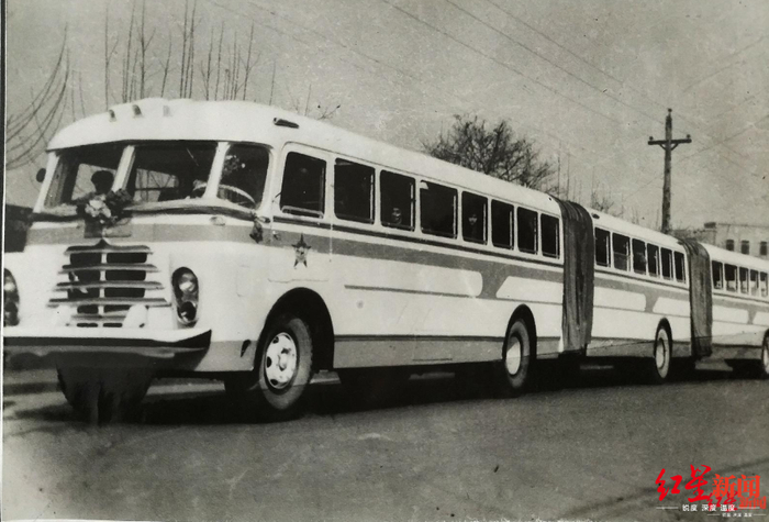 ▲1959年,成都打造的中国第一辆三联式公共汽车曾上过次年的人民日报头版