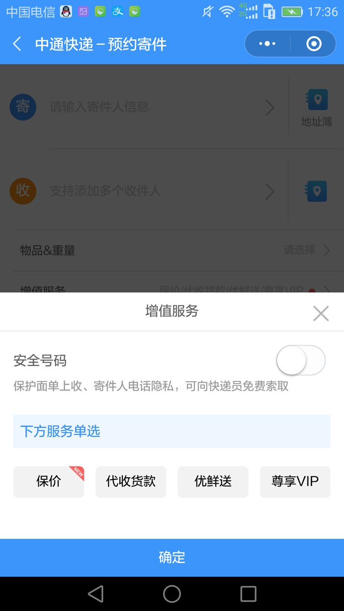 ↑进入中通快递小程序,选择预约寄件后,打开“增值服务”选项,看到了“安全号码”按钮。