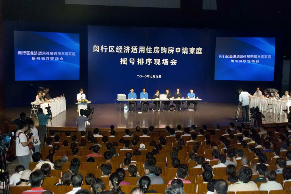 图说:2010年7月上海市首批经济适用房摇号闵行区经济适用住房购房申请家庭摇号排序现场会。闵行区档案局供图