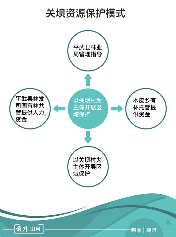 这个阶段的资源管理也有一个问题,白熊沟内林地权属比较复杂,有平武县林业发展总公司(简称林发司)管理的国有林,有木皮乡政府管理的乡有集体林,有村上管理的村有集体林,有关坝组管理的队有集体林,还有分到户的自留山(也是公益林),彼此之间还存在一定的权属纠纷。按说未经允许直接进入国有林是不符合规定的,但国有林管理单位人员有限,怎么办?类似关坝这样的情况在平武不少,整个火溪河流域有接近30万亩。在山水的协调下,平武县林业局、林发司、木皮乡政府、关坝村、水务局、平武县森林保护协会等部门对建立关坝沟流域自然保护小区进行研讨,最终大家同意整合资源,授权共管。2016年9月,经过6个月的讨论细化以及申报备案,平武县关坝沟流域自然保护小区成立。这时,大熊猫国家公园体制试点也开始,关坝的社区保护与发展进入到第三个阶段——以关坝流域自然保护中心为主体,尝试在不改变林地权属的情况下,各部门整合分散管理的森林资源,统一行使管理权、保护权及部分经营使用权。