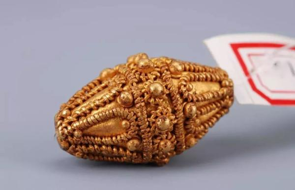 榄形嵌花金珠 东汉(公元25—220年) 2001年合浦县九只岭6a号墓出土 广西壮族自治区博物馆藏