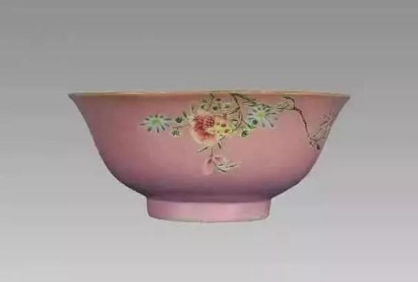 胭脂红地粉彩折枝石榴花卉纹瓷碗外壁胭脂红釉作地,绘粉彩垂枝石榴和蓝料彩花卉纹;碗内施满白釉,底面绘矾红彩不规则的五只蝙蝠。足端露胎,胎质坚硬洁白,呈滚圆的“泥鳅背”状。圈足内手书“大清乾隆年制”六字三行印章款。此碗制作规整,胎质细密,釉彩润泽鲜艳,绘画技艺娴熟,堪称清代乾隆年间景德镇民窑制瓷精品。