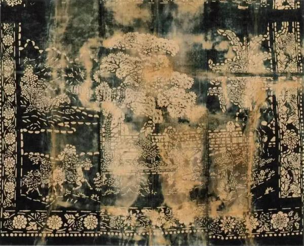 明代蓝印花布被面长192cm,宽127cm,布幅宽42cm。被面上下分别留33和31cm的蓝色空间。四边框饰花鸟狮子滚绣球图案。主体图案为人物庭院,1965年出土于上海县马桥乡三友大队。