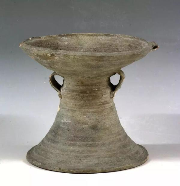原始瓷豆口径17.4厘米,底径16.5厘米,高15厘米。原始瓷是由陶器向瓷器过渡阶段的产物,也可以说原始瓷器是瓷器发展的低级阶段。此件原始瓷豆灰色胎,局部紫褐色,质硬。豆盘内施青黄色釉,釉面较多剥落。敛口,口沿旁有3个贴耳,浅弧腹,喇叭形高豆柄,豆柄上部与盘相接处贴环耳。沿面饰弦纹,圈足饰凸棱纹。器形与福建黄土伦文化的硬陶豆相似,说明马桥文化与南方文化有交往。