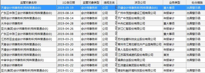 Wind数据也显示,今年年初至今,共有10家会计师事务所接受到13次处罚,其中亚太(集团)会计师事务所(特殊普通合伙)、天健会计师事务所(特殊普通合伙)、正中珠江分别受到两次处罚。