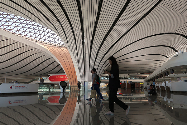 北京大兴国际机场采用国内混流、国际分流、集中中转的形式。大兴机场航站楼采用国内旅客进出港混流的设计,这样无论是出发的旅客还是到达的旅客,候机还是抵达,都能同步享受到商业资源和公共服务设施资源,到达旅客可以共享出发的餐饮商业区。
