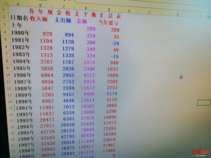 他把每一年的支出和收入做了统计和比对,从记账本里可以看见,1984年,他家总收入是2707元,总支出是1767元;1994年,家庭总收入是37911元,总支出是20438元;2018年,家庭总收入是152642元,总支出为126062元。