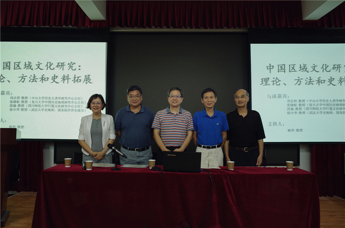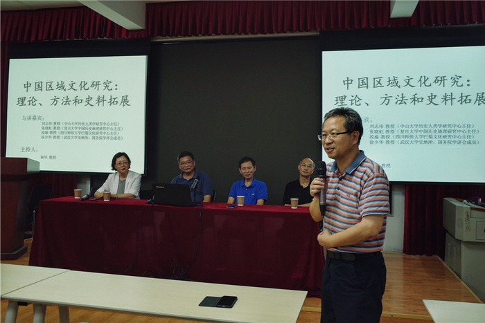 9月19日,在武汉大学振华楼历史学院101教室展开了一场题为“中国区域文化研究:理论、方法和史料拓展”的学术对谈。与谈嘉宾分别是中山大学文化人类研究中心主任刘志伟教授、复旦大学历史地理研究中心主任张晓虹教授、四川师范大学巴蜀文化研究中心主任段渝教授以及武汉大学史地所徐少华教授。四位分别来自珠江流域和长江上、中、下流域的专家,从历史地理学、历史人类学及考古学的不同研究取径出发,就理论、方法和史料拓展等问题对中国区域文化研究展开讨论。这场学术讨论是武汉大学中国传统文化中心主办的 “珞珈中国传统文化论坛”的129期,由武汉大学中国传统文化研究中心主任杨华教授主持。