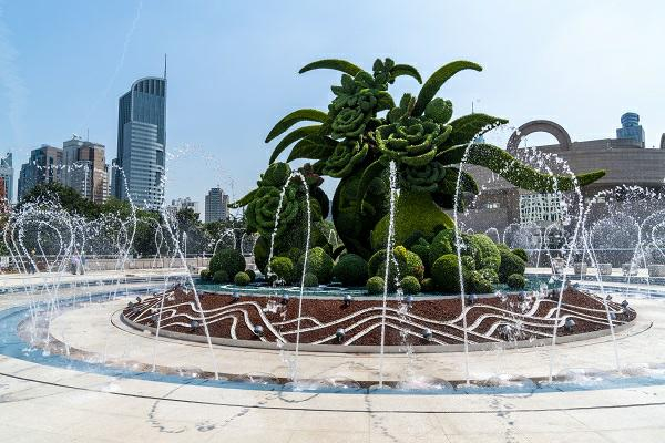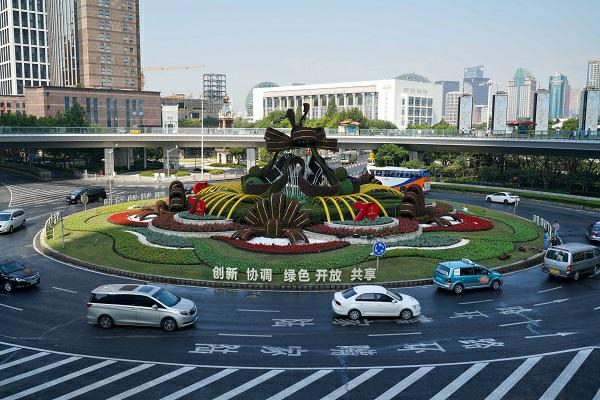 比如,人民广场的“情怀”立体花坛,整体高度达12米,中心花坛面积900平方米,以三个不同形态的花瓶组合进行演绎,瓶身勾勒“绿水青山”,瓶内布置牡丹、百合、月季、茶花以及桃子、石榴等花卉果实,展现绿色发展与繁荣,歌唱热爱祖国的情怀以及追求自然的和谐。