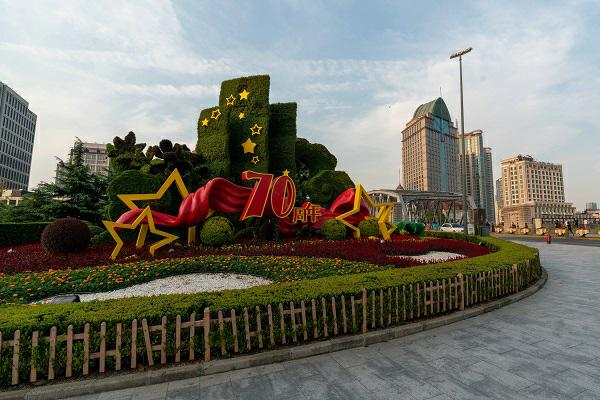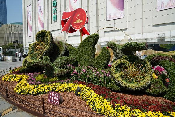 从年初开始,本市绿化部门就精心准备设计方案,精选花卉品种。据统计,今年国庆期间,全市布置花坛花境面积约14万平米,组合花箱3.8万组,灯杆花球3300只,主题绿化景点73个,“申字型”高架摆花16万箱,单季用花量达到1340万盆。